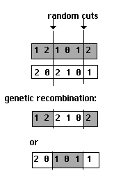 'Breeding' or 'crossover' in genetic algorithms is often done using only one random point rather than two (see for example Holland 1992). One chooses a random spot at which to cut both strategies A and B, creating a new strategy that combines that section of A left of the random cut with that section of B right of the random cut, or vice versa. One consequence of this simpler mechanism for recombination, however, is that the ends of a strategy are treated differently from the middle. Consider the digits at the very ends of strategy A. With a single random cut, either of these digits may end up being the only element from A dropped into an otherwise different strategy. This does not hold for digits between the ends, which on a single cut will always reappear with at least one original neighbor. In choosing two points for cuts instead, including the possibility of a cut 'after the last digit', both this positional bias or 'end-effect' and other difficulties noted in the literature are significantly reduced (see Eshelman, Caruana, and Shaffer, 1989, and Mitchell 1996).
