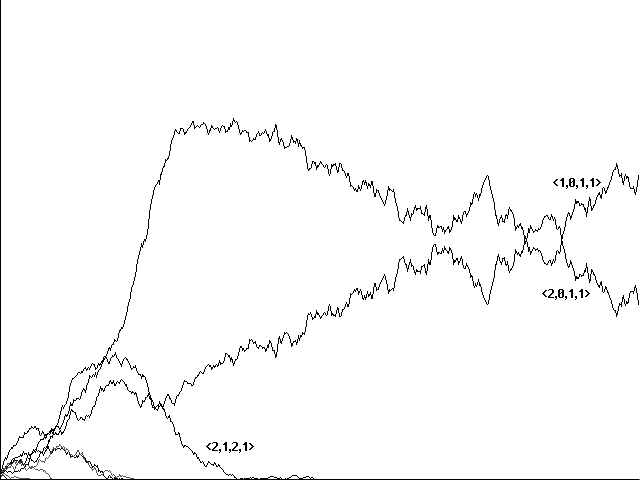 Does genetic recombination for these more complicated strategies still lead to evolution of perfect communicators and their eventual dominance in a population? Initial runs suggested a negative answer. Figure 7a, for example, shows a confused run toward <0,1,2,2,1>, <0,2,2,2,0>, <0,1,2,2,0>, and <0,2,2,2,1> in 10800 centuries. Figure 7b shows a similarly confused run toward the same strategies in 5761 centuries. In neither case did our 'perfect communicators' emerge and dominate.