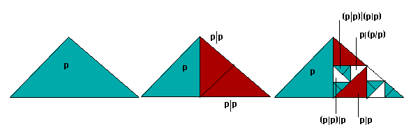 At the next step we take each of the new triangles thus created, divide half of their space into two, and embed in each of these smaller triangles an appropriately colored image of the whole--representing Sheffer stroke formulae (a|b) of the present formulae over all previous formulae and Sheffer stroke formulae (b|a) of all previous formulae over the present.