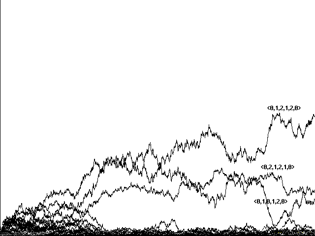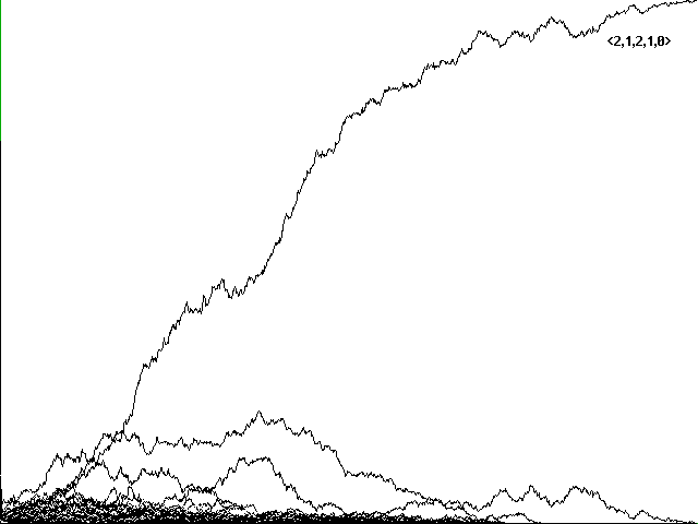 Both of these theoretical points can be illustrated experimentally. If we seed our initial array entirely with <1,2,1,2,0> or <2,1,2,1,0>, we can track the random walk of predators through alternating rounds of predation, warning and hiding, and predation again. We can track a random walk of food items uniformly unannounced and uneaten.