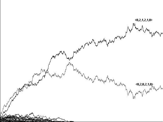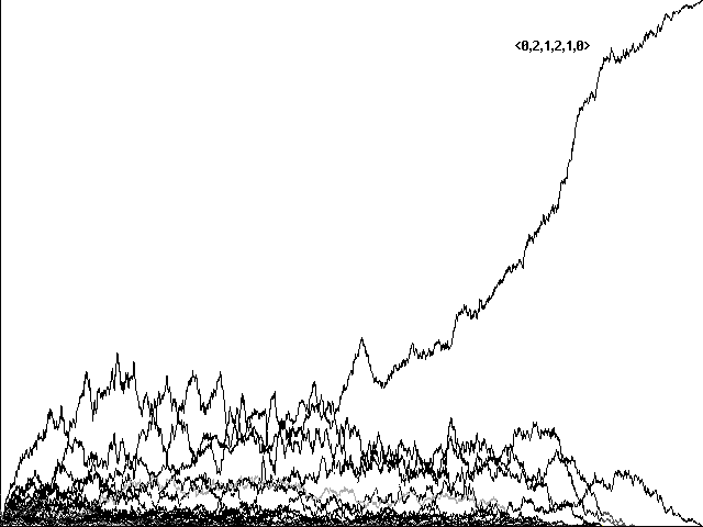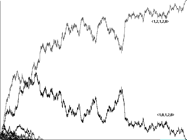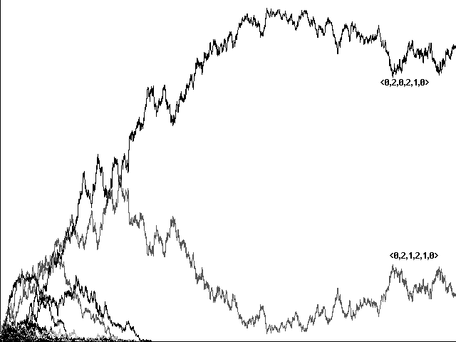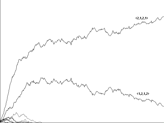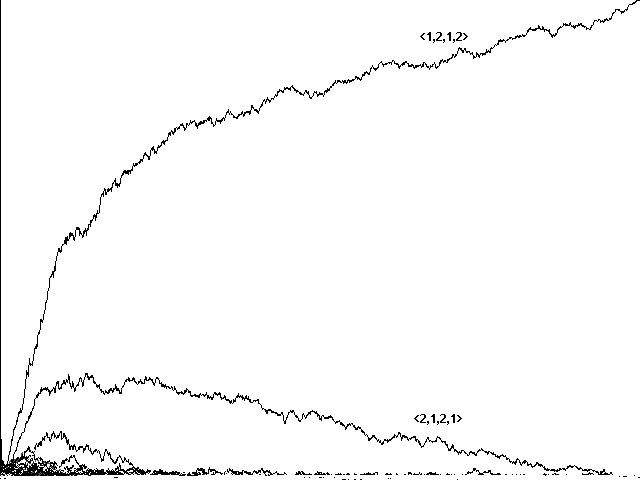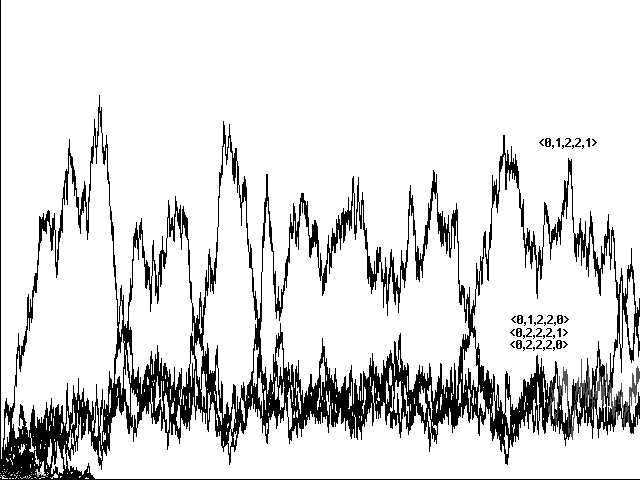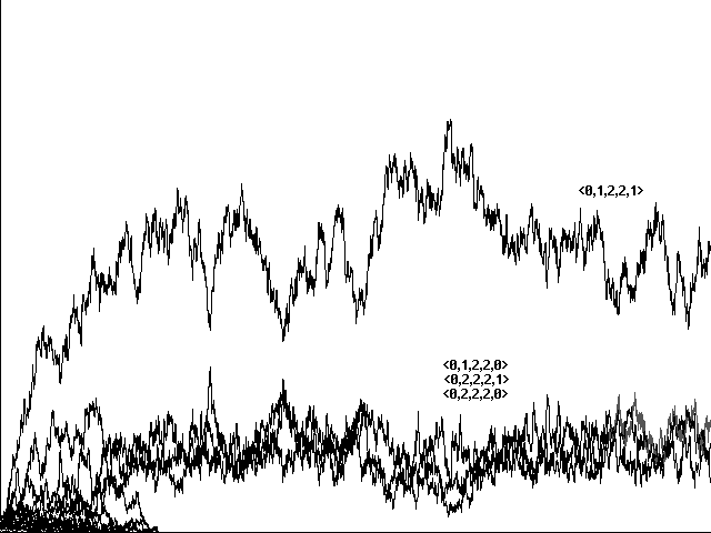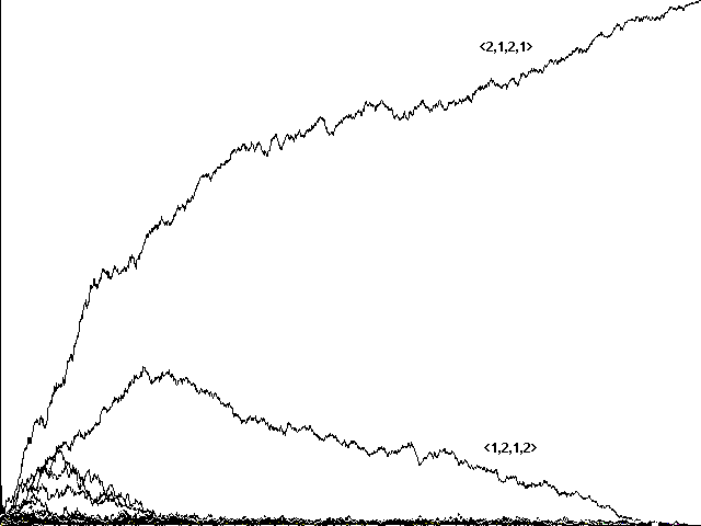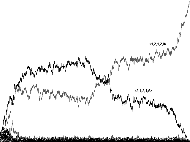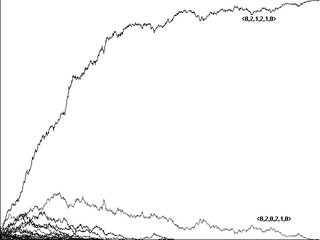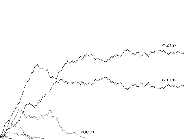 Does genetic recombination for these more complicated strategies still lead to evolution of perfect communicators and their eventual dominance in a population? Initial runs suggested a negative answer. Figure 7a, for example, shows a confused run toward <0,1,2,2,1>, <0,2,2,2,0>, <0,1,2,2,0>, and <0,2,2,2,1> in 10800 centuries. Figure 7b shows a similarly confused run toward the same strategies in 5761 centuries. In neither case did our 'perfect communicators' emerge and dominate.