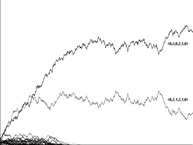 In a final series of experiments we expanded the model above to six-tuple strategies <, f, h, s1, s2, s>, with variables indicating what a cell does when neither fed nor hurt (make sound S1, make sound S2, or make no sound), what it does when fed f or hurt h (the same three options), and what it does when it hears sound S1, sound S2, or no sound s (open its mouth, hide, or 'rest' in neutral). With a sample space of 729 strategies, we started runs with an initial 18 Adams and Eves. Having learned our lesson, all models were run using stochastic imperfection. Where strategies indicate a '1' for making a sound, they in fact make that sound with a probability of 90%; options 0 and 2 appear in such a case with probabilities of 5% each.