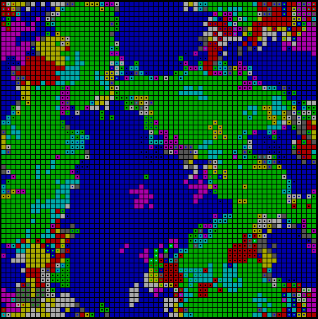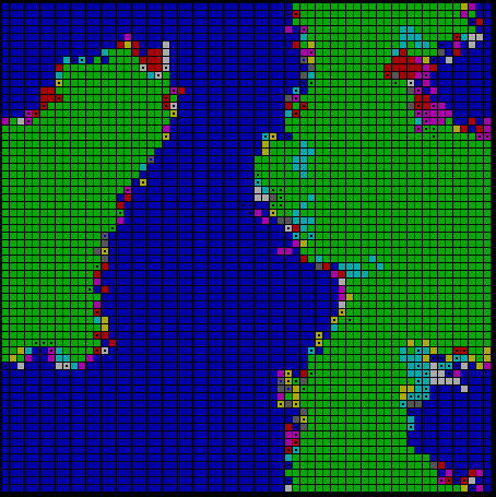 A model that starts instead with a small number of initial Adams and Eves, and in which successful strategies emerge through genetic recombination, solves this problem. One promise of localized genetic algorithms was therefore a model that would allow us to work with a larger sample space of more complicated strategies, still modeling strategy change in terms of local action within a spatialized array, but without forcing us to swamp an initial array with a randomization of all strategies at once.