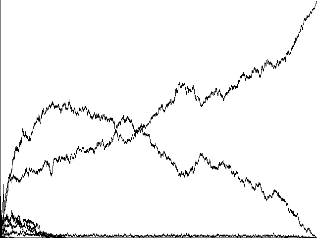 Fig. 8a Evolution to a perfect communicator in a stochastically imperfect world. 10800 centuries shown, using the same Adams and Eves and initial configuration as in 7a.