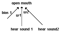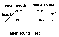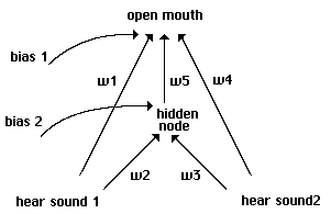 - We are deeply indebted to Laurene Fausett for helpful correspondence regarding training algorithms for nets of the structure used here. Our simple net combines perceptron-like connections (along weights w1 and w4) with crucial use of a single hidden node; it will be noted that the training algorithm also combines a perceptron-like training for w1, w4, and w5 with full backpropagation to update w2 and w3. [back]