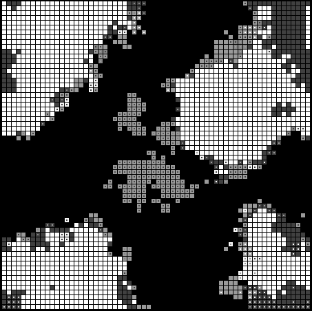 An important difference between the dynamics of feeding and predation is thus built into the structure of the model. With a gain for feeding equal to a loss for predation, and with equal numbers of food sources and predators, that difference in dynamics means that emergence of communication regarding food will be strongly favored over communication regarding predators by the structure of the model. This is indeed what we found in earlier genetic models (Grim, Kokalis, Tafti, and Kilb, 2000b). One way of compensating for the difference in order to study emergence of communication regarding both food and predators is to build in losses from predation which are unequal to gains from feeding. Another is to have an alarm signal which indicates the presence of a predator whether or not one is 'hurt'. A third alternative, which we have chosen here, is simply to proportion food sources and predators accordingly. [back]