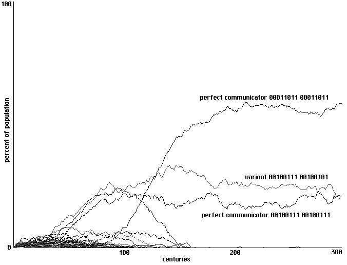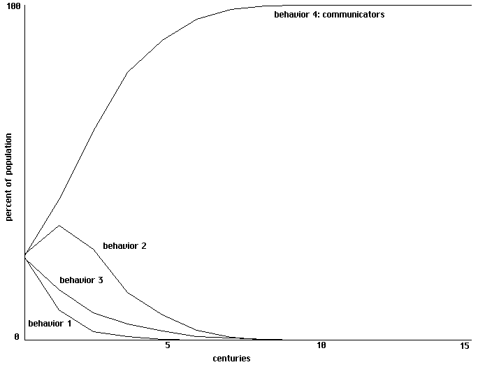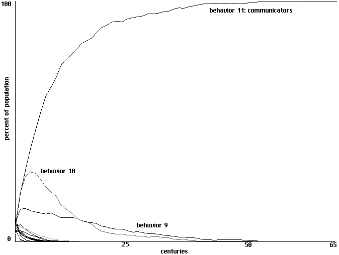 spatialization that favors either cooperation (Grim 1995, 1996) or the triumph of communicators