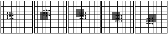 In an array composed entirely of 'communicators', a chain reaction can be expected in terms of food signals and successful feeding. One communicator signals that it has been fed, with the result that its neighbors open their mouths on the next round. The wandering food item then lands on one of neighbors (or the original cell), and that cell in turn makes a sound which signals its neighbors to open their mouths. As illustrated in Fig. 2, one can watch a wandering food item cross an array of communicators, hitting an open mouth every time.
